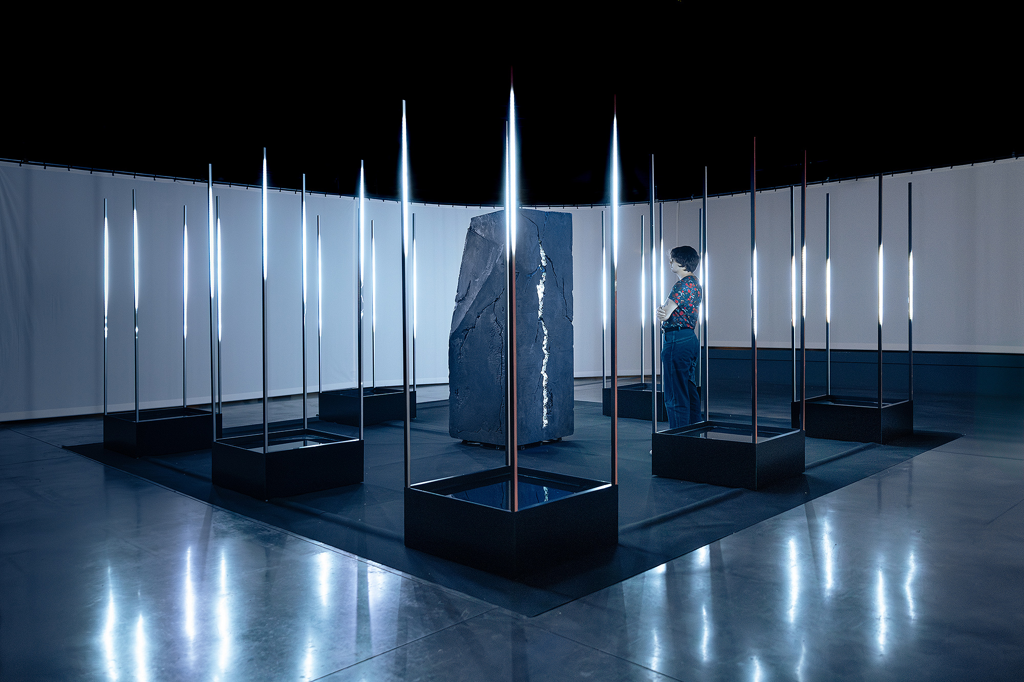 8.33, Perception of the Invisible unfolds as a spatial mesh that reveals the presence of cosmic particles in our environment.